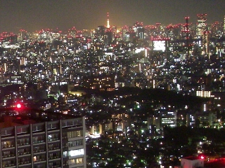 元々の明るさが自分にはよくわからないのだけど、これでも節電で普段より暗い夜景なのだろうか。右手にはライトアップされた東京タワー。左手にはシルエットだけの東京スカイツリーが望める。スカイツリーがその巨体の割に開けた、比較的高い建物が少ない場所に立っているのに対し、東京タワーは高層ビル群のただ中。囲み建つビルの頂きという頂き。そこに赤く燈る航空障害灯の明滅に、埋もれるように立っていたのが印象的だった。