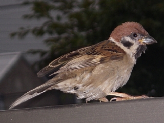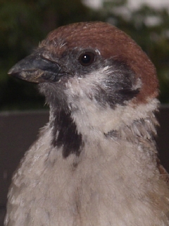 嘴に何かつけたままのスズメ。
