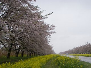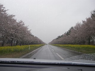 Diary 桜前線追いかける旅の記録 後編 ■2007/05/02 水 5日目(続) 7時を周り、人もそろそろ増えてきた。弘前城を出てR7を南下、秋田県に入る。八郎潟干拓地の「菜の花ロード」の菜の花が見ごろだという情報を仕入れていたので、大潟村へ向かう。橋を渡って干拓地に入ると、菜の花の黄と桜色に縁取られた、ずーっと伸びる直線道路。そして周りは、原野。 桜が散り頃で、桜混じりの雨風が吹きつける道。蕾へ向かって走っていた昨日までとは違い、今は満開から散る方に向かって走っている。時折ワイパーが濡れた花弁を巻き込む。その度に拭い方が中途半端になり、ガラスに半円の拭きムラが残る。 走っていると一気に駆け抜けてしまいそうだったので、じっくり見ようと脇に車を寄せる。 桜には少しずつ、緑が目立ち初めている。風に散る花弁が、道路の上にも、停めてある車の上にも、そして菜の花の上にも。 戻って車に乗り込むと、フロントガラスにも。 大潟村を抜け、そのまま男鹿半島へ。海岸を走り、先端の入道崎へと向かう。12時半頃に入道崎着。この入道崎に北緯40度のラインが走っているらしい。碑には北緯40度の地、と刻まれている。 大間や龍飛に比べると、周囲は栄えた感じ。何軒も連なる土産物屋をぷらぷらと見学。像や人形は何体もあったけれど、生きた? なまはげはいなかった。 入道崎から、晴れなら絶景だったろう海岸線を、反時計回りに走る。残念ながら霧。八郎潟が見渡せそうな寒風山にも登ったけれど、視界数十メートルの霧の中。仕方なく男鹿半島から撤退し、秋田市を抜けて海岸線のR7を南下する。17時過ぎに道の駅「岩城」で風呂。更に南下して道の駅「にしめ」で宿泊。 ■2007/05/03 木 6日目 こうした旅の場合、日付や曜日の感覚があるのは最初の三日くらいで、このくらいの日数になるとそういう感覚をすっかり無くしている。携帯電話の画面表示を見て「ああ、今日は木曜日か」と思わないと、木曜日にはならない。 久しぶり朝ゆっくりと行動開始。天気は曇り。引き続き、海岸線を南下する。秋田県もあとわずか。象潟という所で、田んぼの中にぽつぽつと小高い丘が点在する、陸の松島のような地形を見る。九十九島といい、元は海に浮かぶ島だった所が、地震による海底隆起で陸地の島になった、とのこと。 やがて、秋田と山形の県境。地図を見ると、東には鳥海山が聳えている…はずなのだけど、見えず。山形に入り最初の道の駅「鳥海」に寄る。天気予報を見ると内陸の方が天気が良さそうなので、海岸線からルートを変更。R7を鶴岡市まで。そこから内陸に入るR112を走り、月山へ向かってどんどん標高を上げてゆくと、天気もどんどん好転する。 雪の尾根尾根を見ながら、そのうち夏のような陽気になる。ここからしばらく、Tシャツ一枚。途中の道の駅や物産館などに寄りながら、ただ走る。 そういえば。色々と土産物屋に寄ったけれど、何かあまり興味を惹かれなくなっている。自分も元は観光地の育ち。こうした業界でバイトしたこともあるし、親も働いていた。ので、「観光地での商売」というのがどういうものかを、ある程度知っている。それに加えて、何と言うか…日本全国のこうした所を見てきて、もうすっかり目が肥えてしまった。 まぁ旅行なんてお祭りみたいなものだから特に気にしなくてもいいけれど。 そう、ひとつだけ。例えば「…限定」という表示のお菓子があるとする。けれど、そういうものは意外とその地元で製造されていなかったりする。それを見分けるには、産地、または製造者がちゃんと標示されているかどうかを見るといいだろう。 意外と多いのが、産地や製造者の標示が全く無く、「販売者」だけ地元の会社が書かれているもの。こういうのはまず、地元の製造ではない。加えて、「…限定」や「販売者」の標示が印刷ではなく「シール」だと、それはもう地元の製造ではないと判断していいだろう。 実際に、自分は長崎の土産物屋でも、今回の東北の道の駅の土産物屋でも、全く同じ袋菓子が「当地限定」シールを貼られて売られているのを見つけてしまった。まぁそんなものである。 ちなみに。自分が土産物を多く買うのは、観光地の土産物屋よりも、普通のスーパーが多い。特に地元限定と謳うわけでもなく、その土地では普通に売られているのに、他の土地ではなかなか手に入らない。そういうものが好きだ。秋田では「秋田いなふく」の「ぬれおかき」や、しょっつる味のあられ。山形では「おしどりミルクケーキ」などを、普通のスーパーの食品コーナーで買って来た。何というか、北海道でいうところの「やきそば弁当」クラスのもの。でも、菓子ばっかり。 寒河江からR287で山形県内部を南下。白鷹町からR133で再び日本海へ向かう。途中「胎内温泉」で風呂。その後秋田県内で走っていたR7に戻り、新潟県入り。新潟市中央部を避けて、ちょっと外れにある道の駅「花夢里にいつ」で宿泊。 ■2007/05/04 金 7日目 佐渡