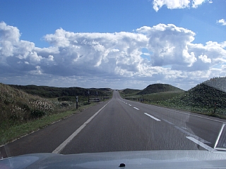 北緯45度。サロベツ原野の中のまっすぐな道を往く。右手の海側は広大な海岸砂丘、左手側は丘陵地帯となっていて、その狭間の盆地のようになった地帯が広大な湿原となっている。この辺りでは地平線も見ることができる。